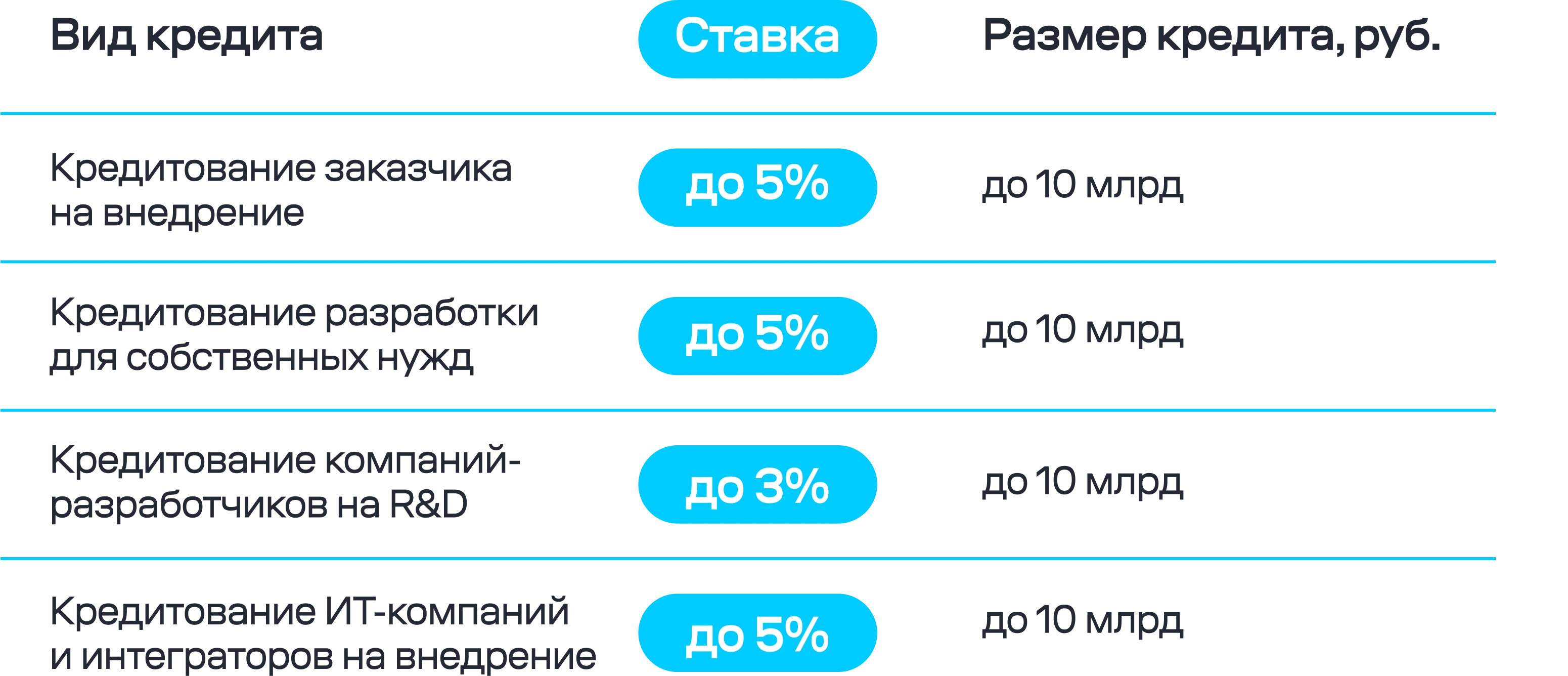 Для разработки и выпуска российских IT-решений можно взять кредит по сниженной ставке от 3% до 5%, в зависимости от конкретного кейса.